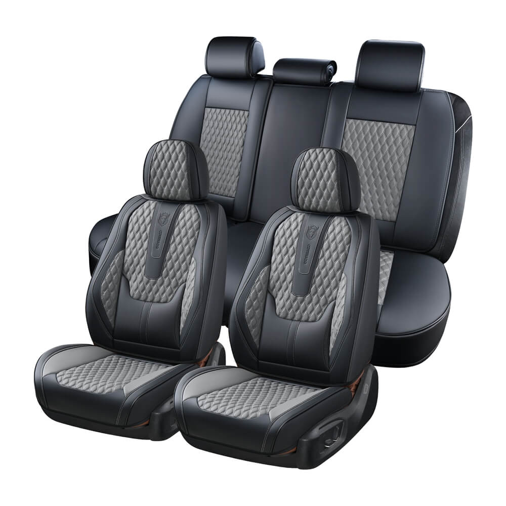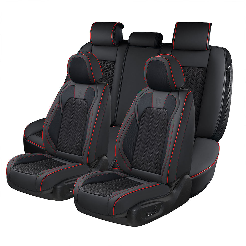 This is our most popular set, and it's easy to see why. Priced at $179.98 (down from $219.99), the SCU003 delivers premium faux leather with built-in lumbar support for the front seats — a feature most competitors in this price range skip entirely. It comes in 19 color options, from classic Black and Gray to bold two-tone combos like BlackPurple and RedWhite. The faux leather is waterproof, breathable, and resistant to UV fading. Spills wipe off with a damp cloth. The full set covers all five seats and works with 40/60 and 60/40 split rear benches.