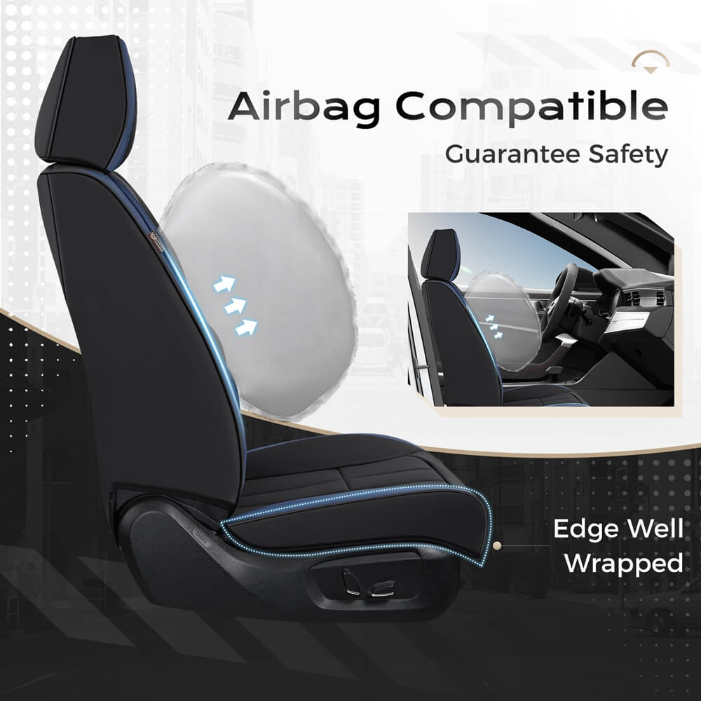 A: Our seat covers come with airbag cutouts and have been tested to not interfere with airbags. The leather seat covers are quality and thick, and they may sightly influence the heated/cooled functions. But you just need to wait a while to let the car seats get cooling or heated.